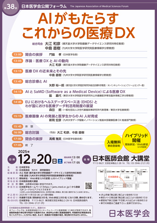 本フォーラムでは、生涯教育制度のカリキュラムコード9(医療情報)3.5単位が取得できます。生涯教育制度の単位等を希望する医師の方は、参加申込の際に医籍登録番号、所属郡市区等医師会名をご入力下さい。入力がない場合、および、各講演が未受講の場合、単位等の付与は行いません。